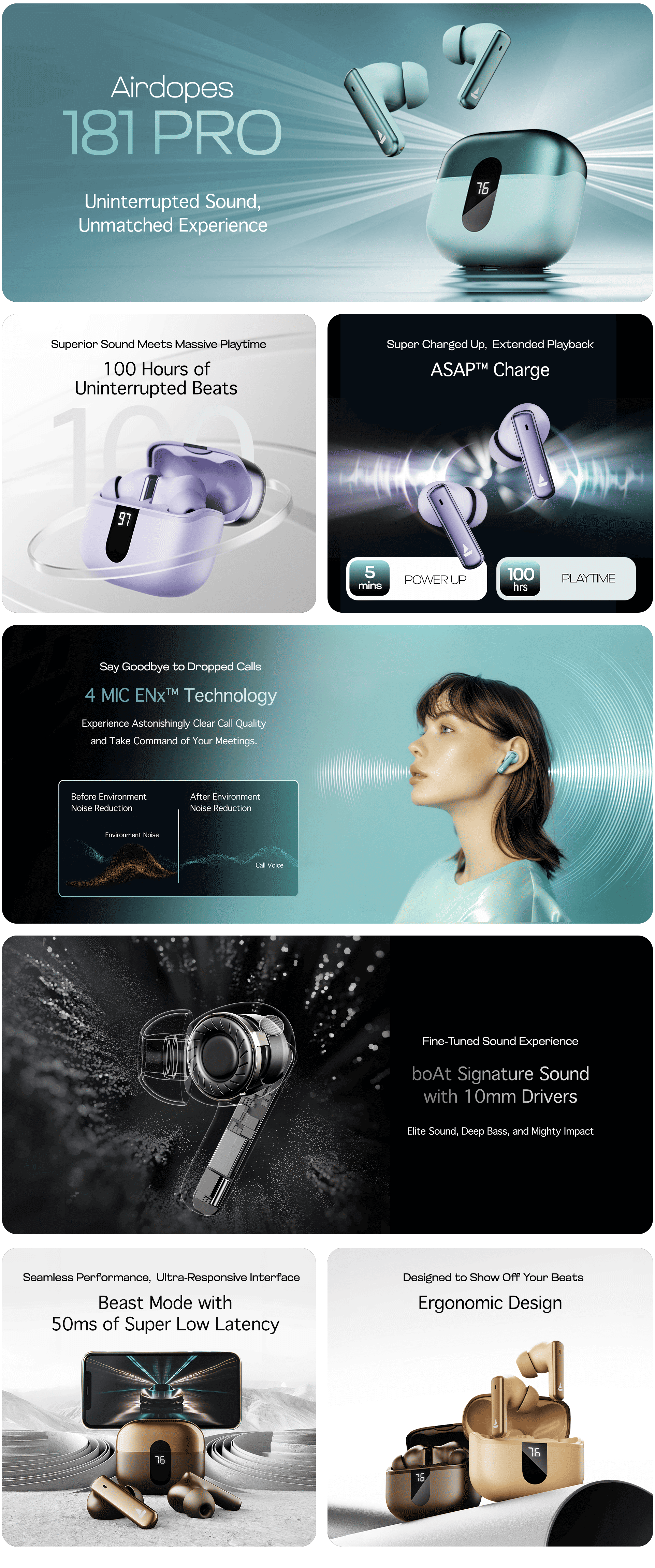 Experience audio fun endlessly with the boAt 181 Pro TWS Earbuds. Tap your feet to your playlist on repeat as 100 hours of massive playtime has got your back. Revisit your favorite tunes while exercising, commuting, or relaxing after a tiring day. Enthralling boAt Signature Sound from two powerful 10 mm drivers adds a punch to the audio across every entertainment format. Be it movies, podcasts, or songs, these earbuds take listening to the next level. Moreover, these earbuds boast lightning-fast ASAP Charge that lends 100 minutes of playtime after 5 minutes of charging so you can return to your series or podcast in no time. Unlike most earbuds, 181 Pro is bound to turn heads with its digital display on the charging case that shows the battery level of the case and both earbuds. With IWP technology, you can experience power-packed sound immediately! Just flip the lid open and enter the audio dimension. Additionally, the ENx-powered quad mics in these earbuds are perfect for calls in public spaces. It won't matter if you are in a crowded room, coffee shop, or on public transport- make and attend calls without looking for a quiet spot. Keeping you at the forefront of your virtual opponents, the 50 ms low latency of BEAST mode eliminates lag for a realistic feel. Call a friend, get live match scores, or play music by activating Siri or Google Voice Assistant with your using voice commands. Featuring IPX5 sweat and splash resistance, these earbuds will keep you entertained no matter where you are. Infuse a dose of audio delight into your mundane routine with 121 Pro Plus!